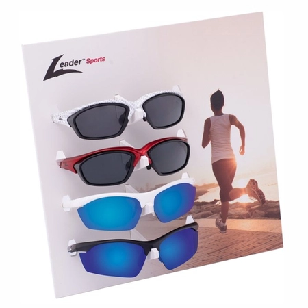 Akrylowy ekspozytor na 4 pary okularów sportowych Leader. Ekspozytor zawiera aplikację. Idealny na biurko czy wystawę. Nie zawiera okularów.