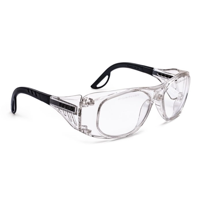 Solidne uniwersalne okulary ochronne marki Infield z możliwością oszklenia przez optyka, według recepty. Wyposażone w zintegrowane transparentne osłony na skroniach oraz zauszniki z regulacją długości i kąta nachylenia.