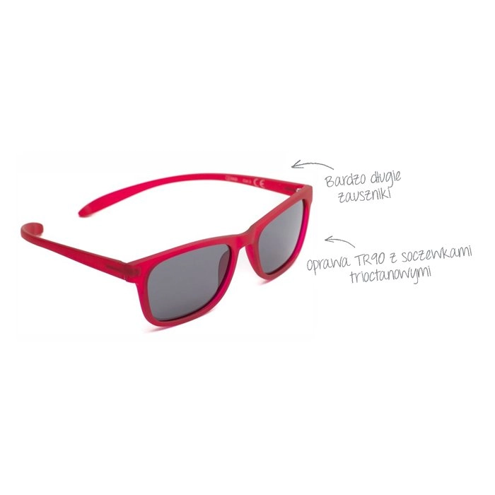 Okulary przeciwsłoneczne dla dzieci o modnym kształcie, wyposażone w ekstra długie i smukłe zauszniki. Dzięki nim okulary idealnie przylegają do twarzy dziecka i nie zsuwają się z nosa. Przyjemny w dotyku materiał TR90. Soczewki trioctanowe, z polaryzacją zapewniają 100% ochrony przed promieniami UV. Barwione soczewki szare, zgodne z normą UE. Produkt oznaczony certyfikatem CE. W komplecie do okularów dołączone jest etui.