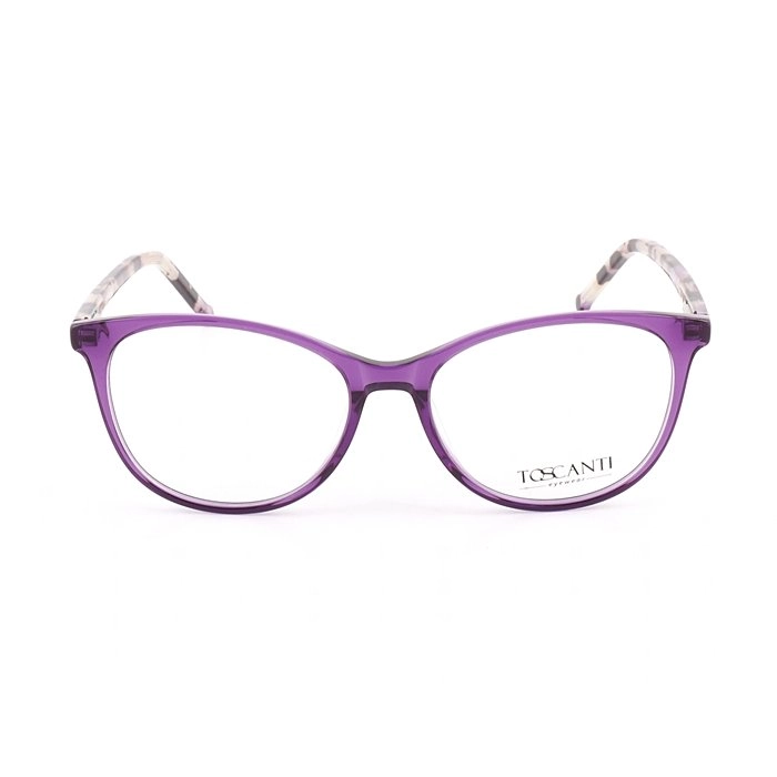 Oprawa korekcyjna marki Toscanti. Posiada sprężyste zawiasy typu flex, które ułatwiają nakładanie okularów. Dodatkowo oprawa lepiej dopasowuje się do kształtu głowy, a zauszniki nie uciskają skroni. Wysoka jakość zastosowanych materiałów oraz trwała powłoka lakieru zapewnia długi czas użytkowania. Oprawa wykonana jest z acetatu co sprawia, że jest lekka i trwała. Okulary odpowiednio trzymają się na nosie, dzięki dobrze wyprofilowanemu nanośnikowi.
