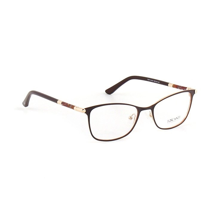 Oprawa korekcyjna marki Toscanti. Posiada sprężyste zawiasy typu flex, które ułatwiają nakładanie okularów. Dodatkowo oprawa lepiej dopasowuje się do kształtu głowy, a zauszniki nie uciskają skroni. Wysoka jakość zastosowanych materiałów oraz trwała powłoka lakieru zapewnia długi czas użytkowania. Oprawa wykonana jest z aluminium co sprawia, że jest lekka i trwała. Okulary dobrze i wygodnie trzymają się na nosie, dzięki nanośnikom wykonanym z miękkiego silikonu.