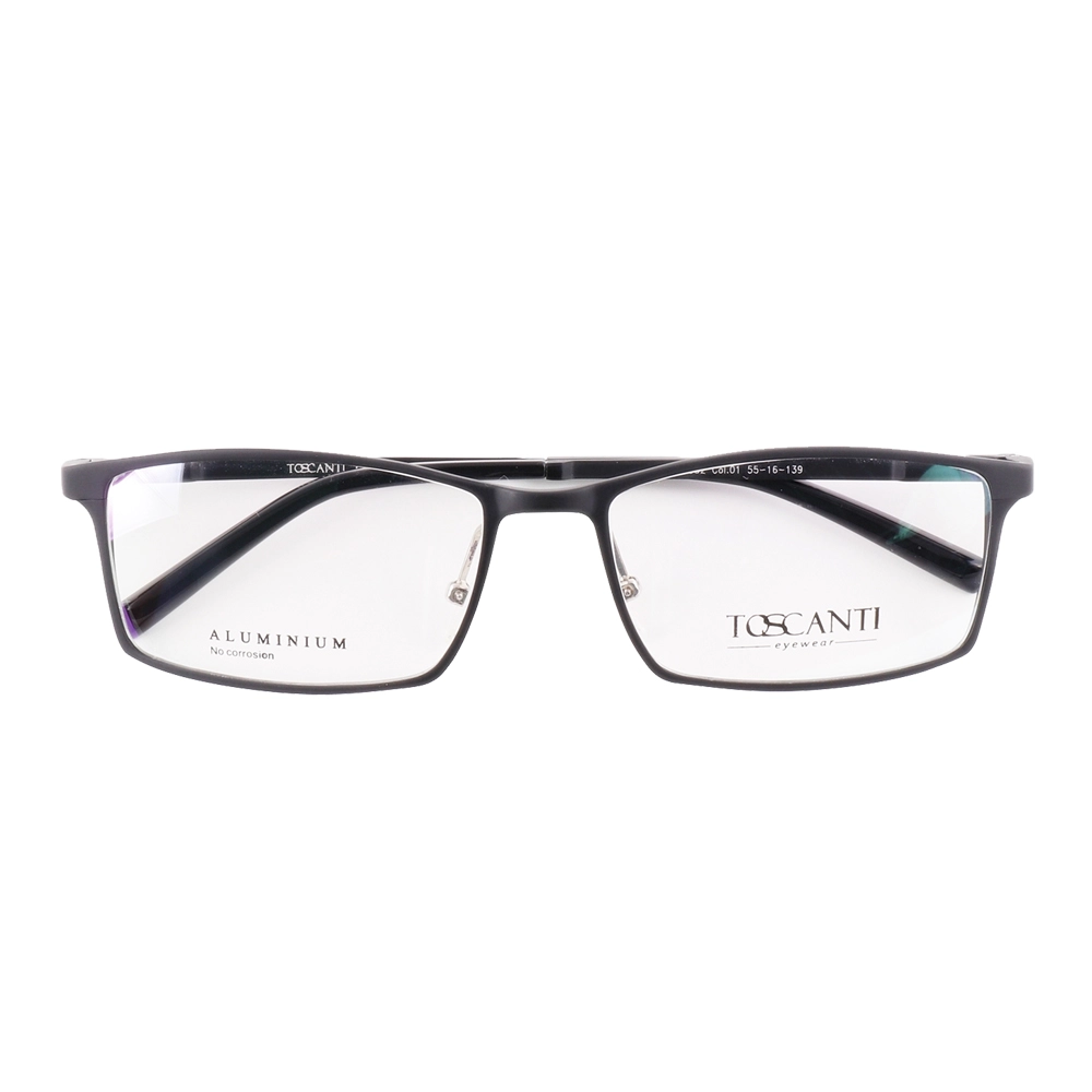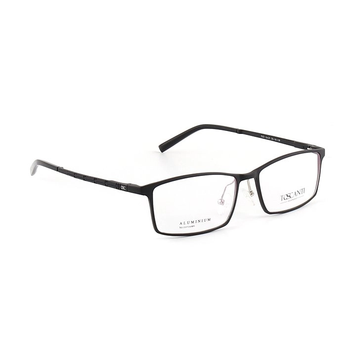 Oprawa korekcyjna męska marki Toscanti. Posiada sprężyste zawiasy typu flex, które ułatwiają nakładanie okularów. Dodatkowo oprawa lepiej dopasowuje się do kształtu głowy, a zauszniki nie uciskają skroni. Wysoka jakość zastosowanych materiałów oraz trwała powłoka lakieru zapewnia długi czas użytkowania. Oprawa wykonana jest z aluminium co sprawia, że jest lekka i trwała. Okulary dobrze i wygodnie trzymają się na nosie, dzięki nanośnikom wykonanym z miękkiego silikonu.