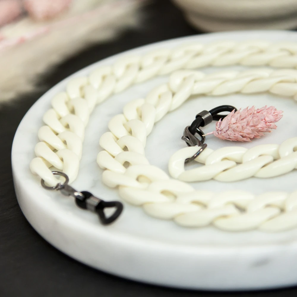 Modne łańcuszki akrylowe do okularów w ciekawych barwach. Lekkie i wytrzymałe. Łańcuszki wyposażone w elementy mocujące umożliwiające bezpieczne połączenie z okularami.