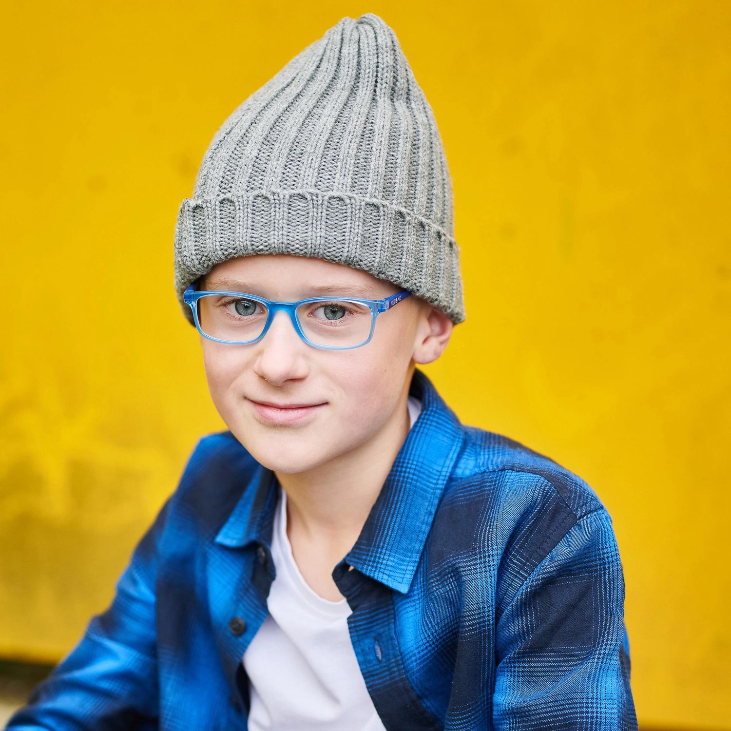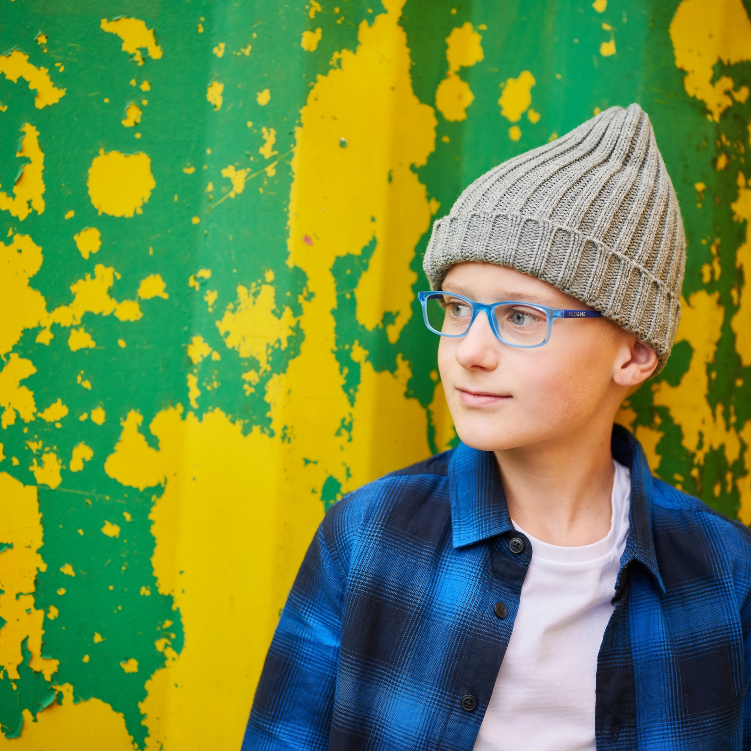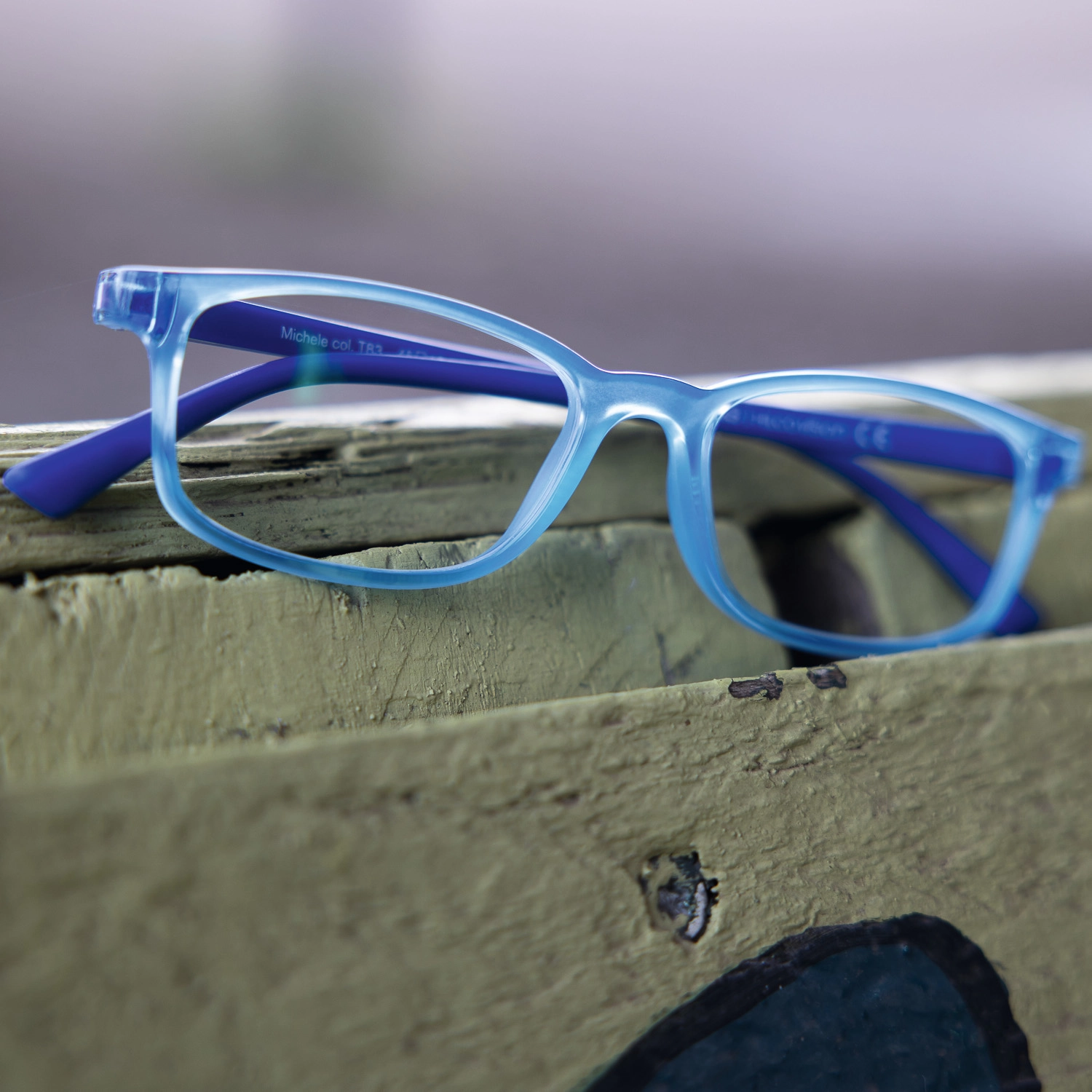 Dzieci noszące MICHELE lubią lekko stonowane, harmonijne kolory. Kompozycje tej samej tonacji, takie jak turkus na tle jasnego lub ciemnego wariantu lub połączenia w kolorze jeżyn, dają jednolity wygląd z subtelnymi niuansami kolorystycznymi. Kanciasty, lekko wydłużony kształt to prawdziwy model unisex dla nieco starszych dzieci w wieku od 6 do 12 lat, które potrzebują okularów, które po prostu pasują do wszystkiego.