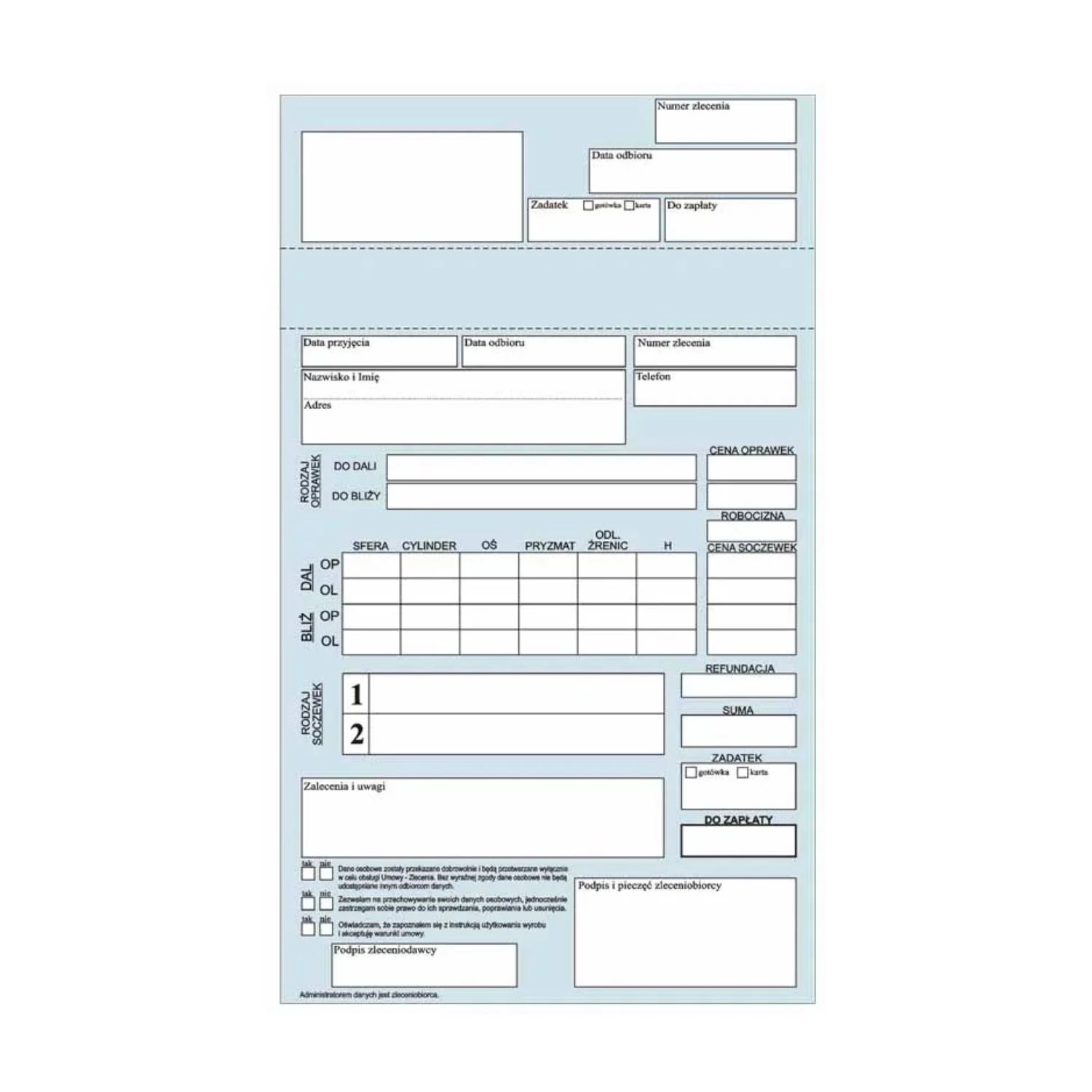 Koperty na prace okularowe bez kopii, z odrywanym paskiem.