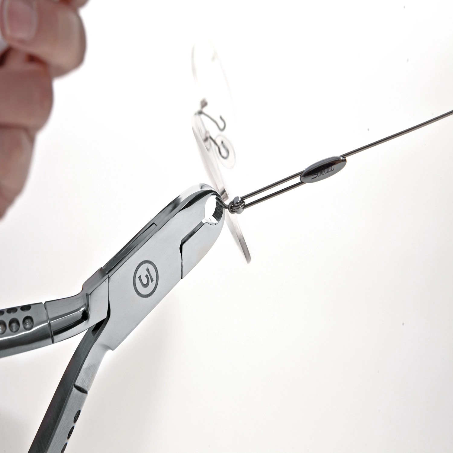 Cęgi z dwoma karbami do łatwego demontażu okularów wierconych typu Silhouette "Minimal Art", jak również w podobnych modelach