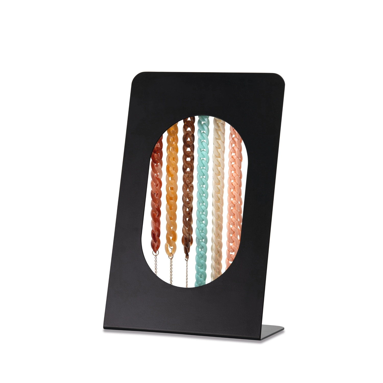 Praktyczny i stylowy ekspozytor metalowy, idealny do prezentacji łańcuszków i sznureczków. Wykonany z trwałego metalu, zapewnia stabilność i elegancki wygląd, który doskonale wpasuje się w każde wnętrze.