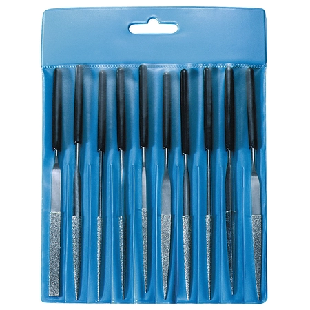 Asortyment diamentowych pilników igłowych do piłowania stali, szkła i ceramiki. Pilniki w różnych kształtach (płaskie, półokrągłe, trójkątne, czworokątne, okrągłe, płasko-ostre, owalne, baretowe, w formie ptasiego języka, w formie noża) znajdują się w plastikowym etui. Długość obrobienia diamentami: 50 mm.