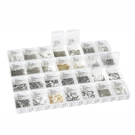 Zestaw najczęściej używanych śrub i nakrętek, który zapakowany jest składane, funkcjonale pudełka