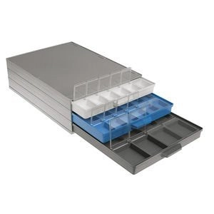 - 3 szuflady w kolorze białym, niebieskim i szarym łącznie z 88 pudełkami