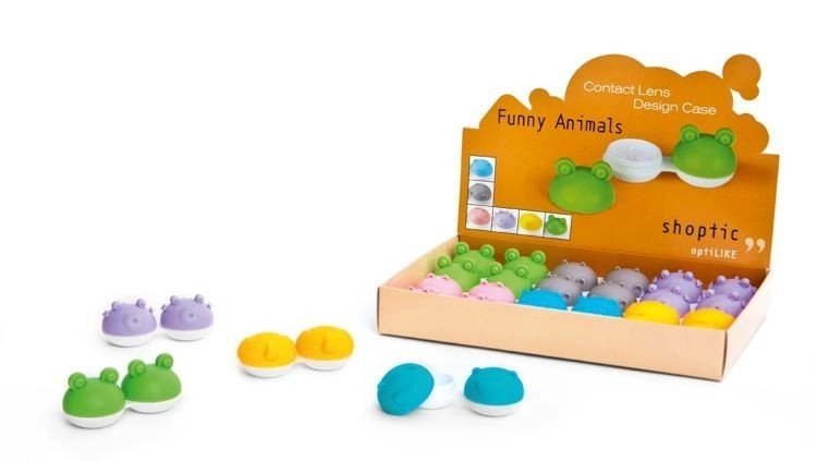 Zestaw szczelnie zamykanych pojemników na miękkie i twarde soczewki kontaktowe „Funny Animals” ( 6 wzorów po 2 sztuki) oraz kartonowy display do ekspozycji o wymiarach 211 x 147 x 30 mm. Wzory: żabka, świnka, hipopotam, miś, rybka, słonik.