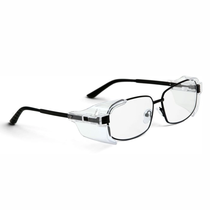Uniwersalne okulary ochronne o modnym kształcie, z osłonami bocznymi. Oprawy są wyposażone w bezbarwne soczewki poliwęglanowe.