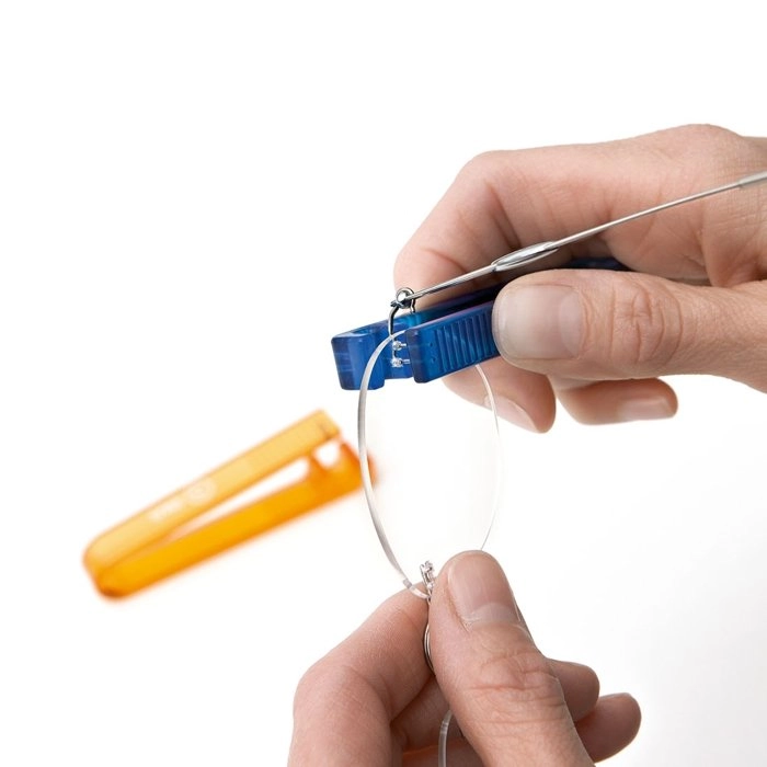Niewielkie narzędzie w postaci pęsety, które pomaga oddzielić soczewki od mostka i zauszników. Pasuje do wszystkich opraw z nitami 1,4 mm oraz standardowym rozstawem wywierconych otworów.