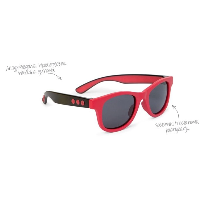 Okulary przeciwsłoneczne dla dzieci wykonane z miękkiego, bezpiecznego materiału. Wyposażone są w gumowe wkładki antypoślizgowe na zausznikach wykonane z wysokiej jakości hypoalergicznego polimeru oraz soczewki trioctanowe, które zapewniają 100% ochrony przed promieniami UV-A i UV-B. Produkt jest oznaczony certyfikatem CE. W komplecie do oprawek dołączony jest woreczek z mikrofibry.