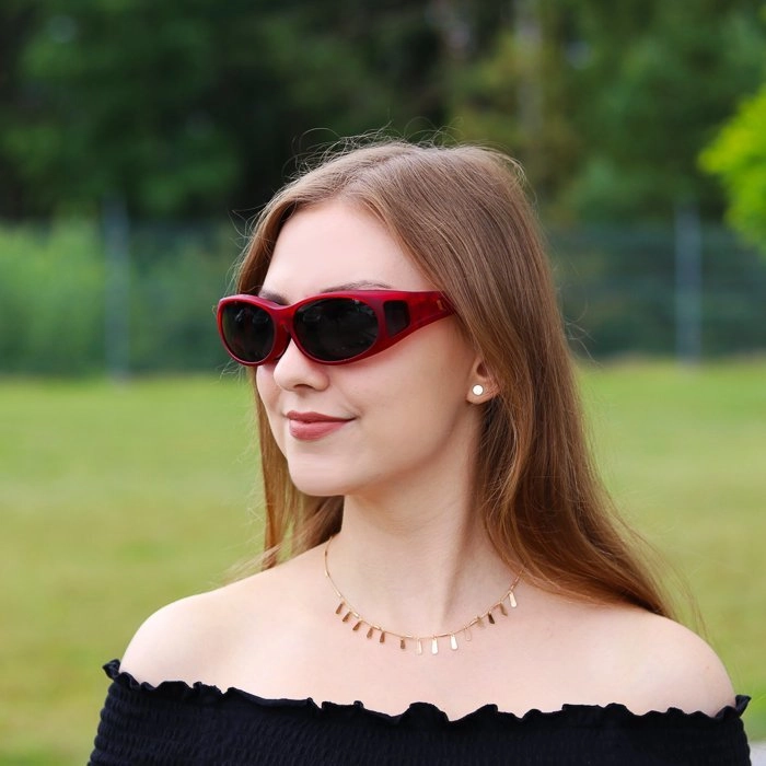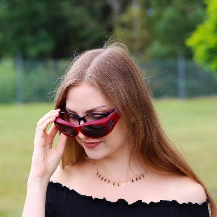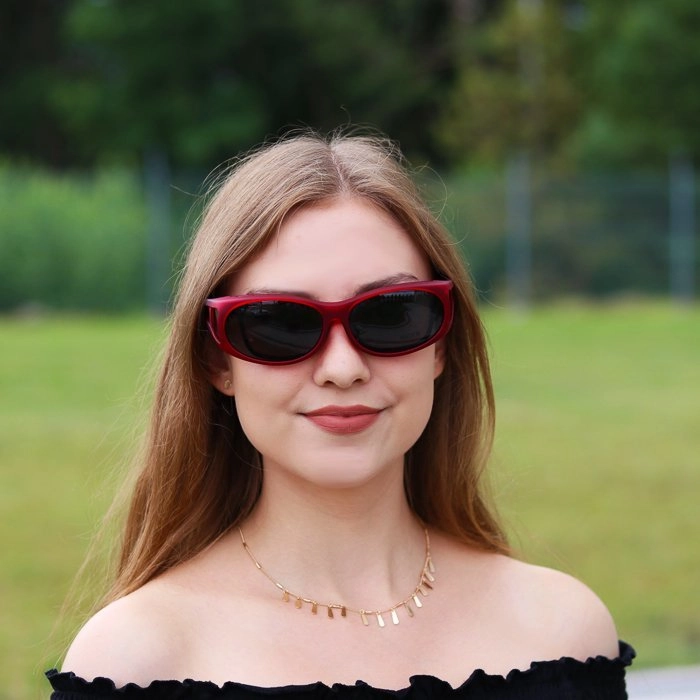 Miękkie w dotyku okulary przeciwsłoneczne do nakładania na okulary korekcyjne o owalnym kształcie oraz ze szczelinami wentylacyjnymi. Zapewniają 100% ochrony przed promieniami UV-A i UV-B do 400 nm. Produkt jest oznaczony certyfikatem CE. W komplecie dołączone jest etui oraz woreczek z mikrofibry.