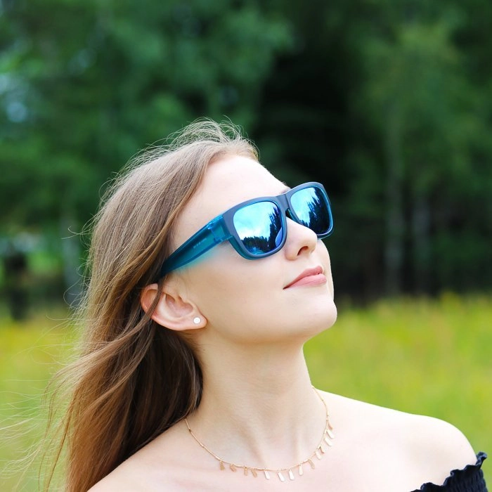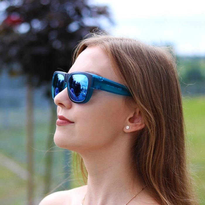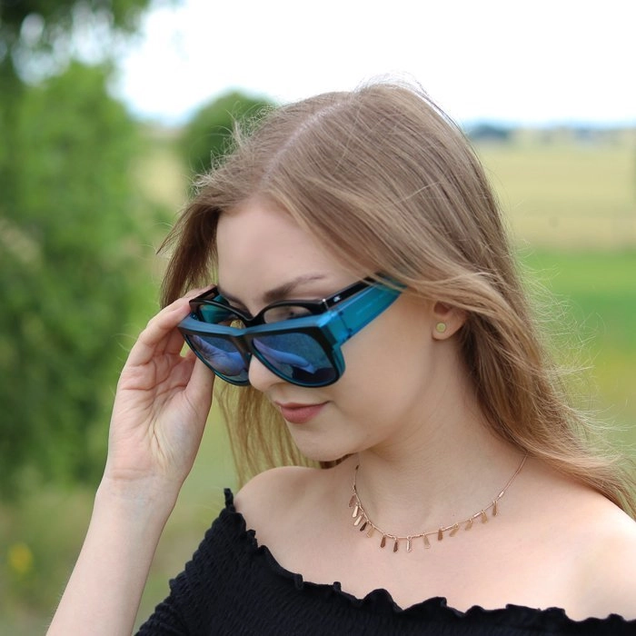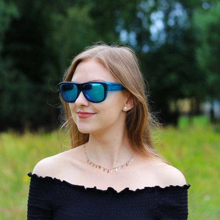 Kolorowe okulary przeciwsłoneczne nakładane na okulary korekcyjne, idealne dla osób, które na stałe korzystają z okularów korekcyjnych.  Posiadają soczewki z lustrzaną powłoką zapewniające 100% ochrony przed promieniami UV-A i UV-B do 400 nm. Produkt jest oznaczony certyfikatem CE. W komplecie dołączone jest etui oraz woreczek z mikrofibry.